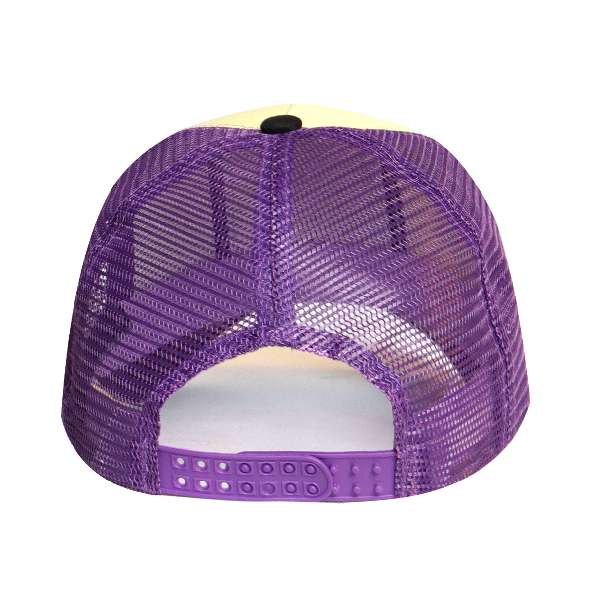 Estilo: Frente color crema suave con visera negra sólida y malla morada transpirable.
