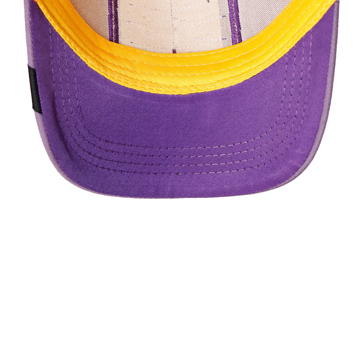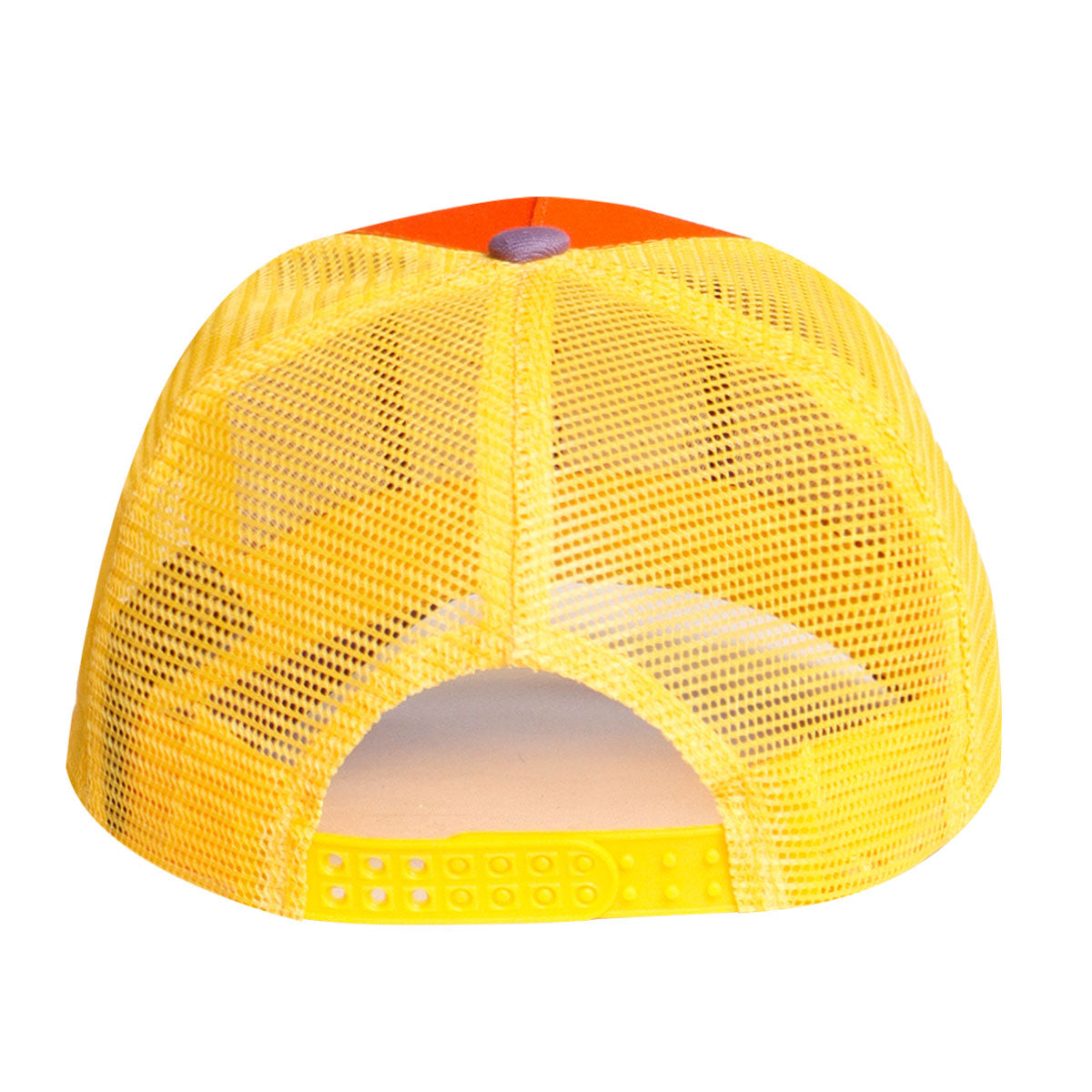 Estilo: Frente naranja vibrante con visera lila y malla amarilla.