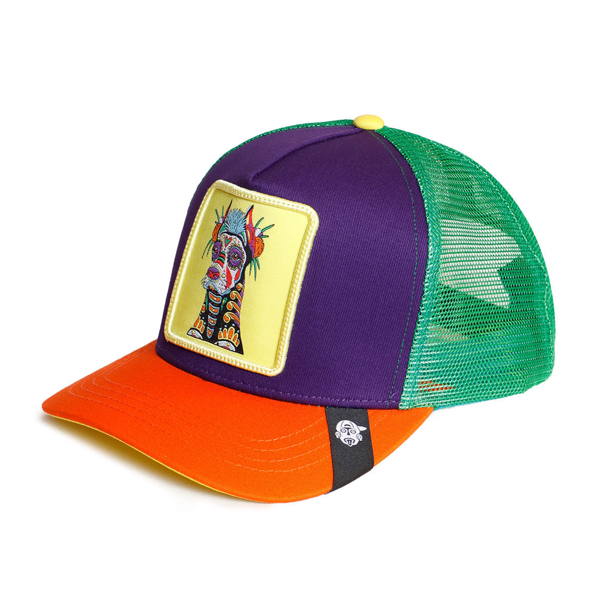 Más que una mascota, el Xoloitzcuintle es el guardián de las almas. Esta gorra rinde tributo a nuestra lealtad más antigua con un diseño vibrante que mezcla el morado místico, la visera naranja fuego y la malla verde bosque. El parche amarillo resalta la figura de un Xolo decorado con patrones de arte popular, recordándote que en México, hasta la muerte tiene color. Ideal para quienes llevan la historia en la sangre y el estilo en la cabeza.
