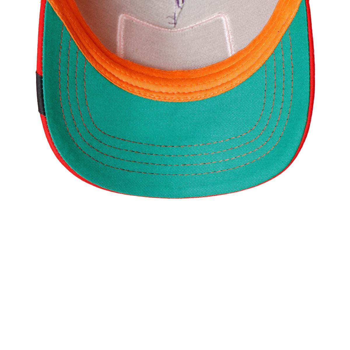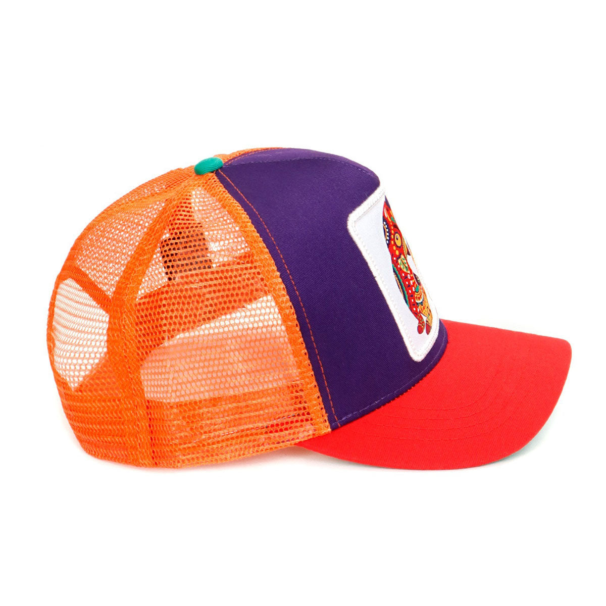 Estilo: Cuerpo morado sólido con visera color coral y malla naranja vibrante.